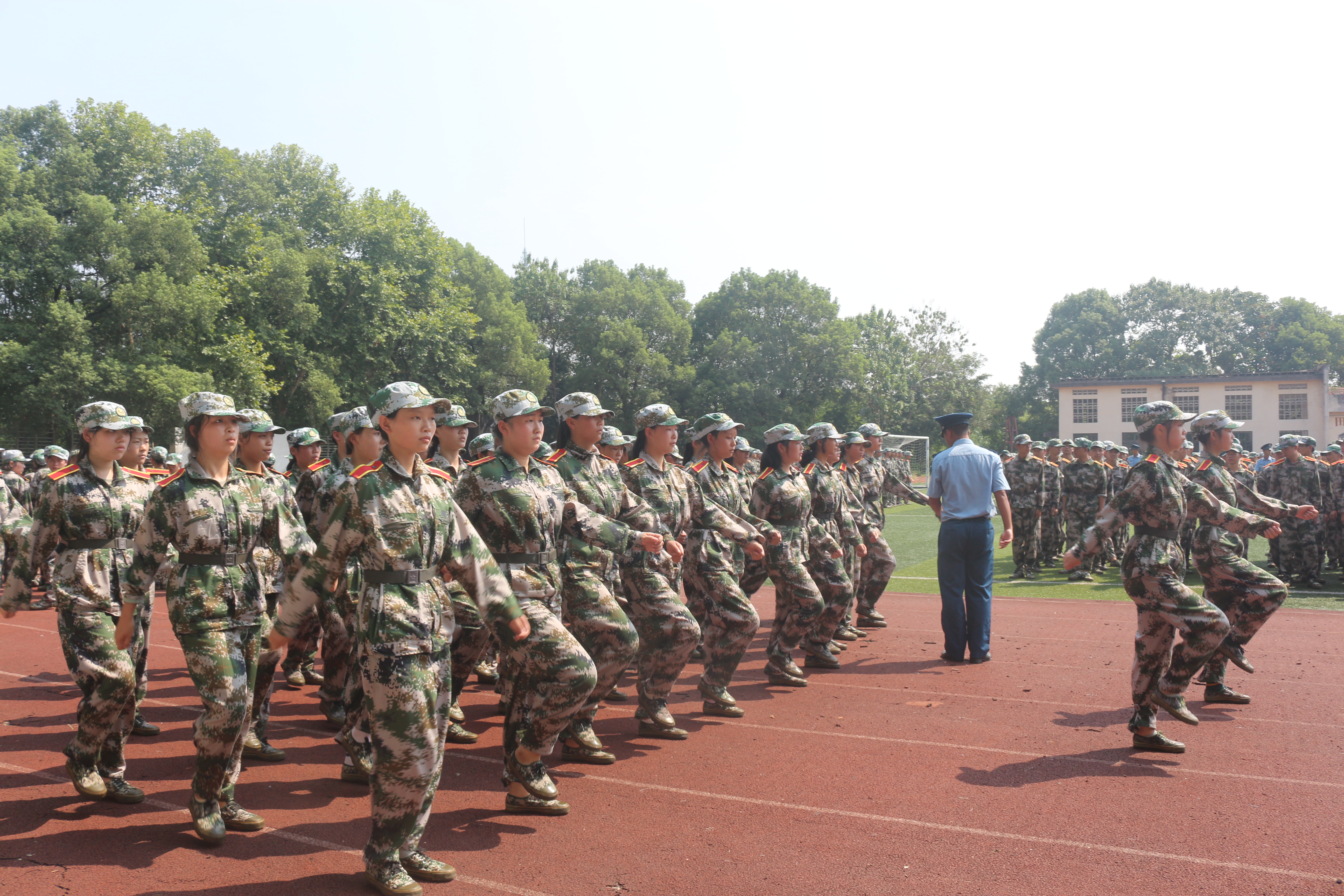 闷热的天气,毒辣的太阳。新生们服装统一,在教官严苛的操练下于田径场里进行着如火如茶的训练。面对炎热的酷暑,反复的训练对于新生来说,不仅是烈日的炙烤,也是汗水的洗礼,更是意志力的斗争,他们克服了日光的暴晒和训练的艰苦,认真地完成教官所安排的军训任务,立正、稍息、跨立、停止间转法、齐步走,正步走等每一个动作都做到标准规范。学院领导也提出了步伐的操练、军体拳的教学、方队组建、训练等项目给军训增添了几分色彩。田径场上各连队队形整齐、口号响亮、精神昂扬,展现出了严整的军姿军容,体现了很好的的训练效果和很高的训练水准。而这些成果都离不开教官们的严加管教、系领导和辅导员们的关怀重视,以及班助们的大力协作。