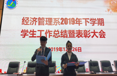 为更好的对本学期工作做总结,鼓励同学们再接再厉,再创辉煌,益阳职业技术学院经济管理系于2019年12月26日上午9:30在船舶大楼报告厅举行2019年下学期学生工作总结暨表彰大会。莅临本次会议的领导、老师有:经管系系主任姚子凤老师、学生处副处长熊立新老师、学工副主任肖建明老师、学工办主任杨芳老师及全体辅导员。本次会议由张艳婷和李斯淇主持。