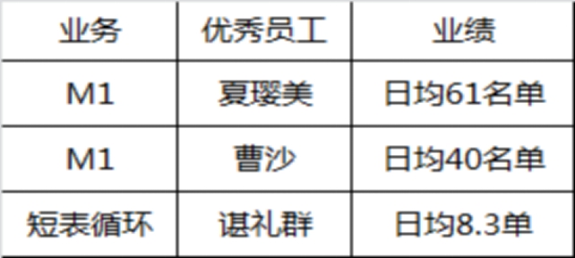 9月业绩排名榜中,夏璎美、曹沙同学荣获中信发卡MGM-M1项目第一名、第三名,获“出单达人奖”冠军和季军,谌礼群同学荣获中信发卡短表循环项目第一名,获“出单达人奖”冠军,我院学生在公司9月份的表彰大会中获奖占比达33%。