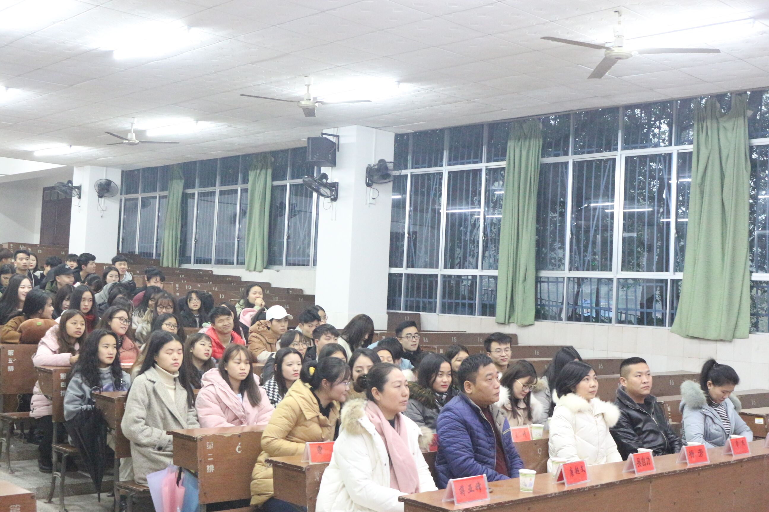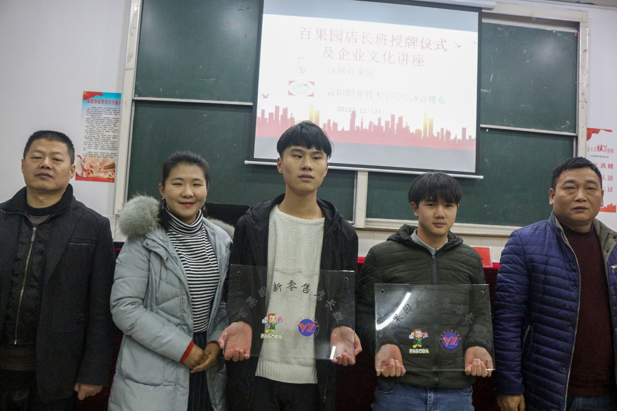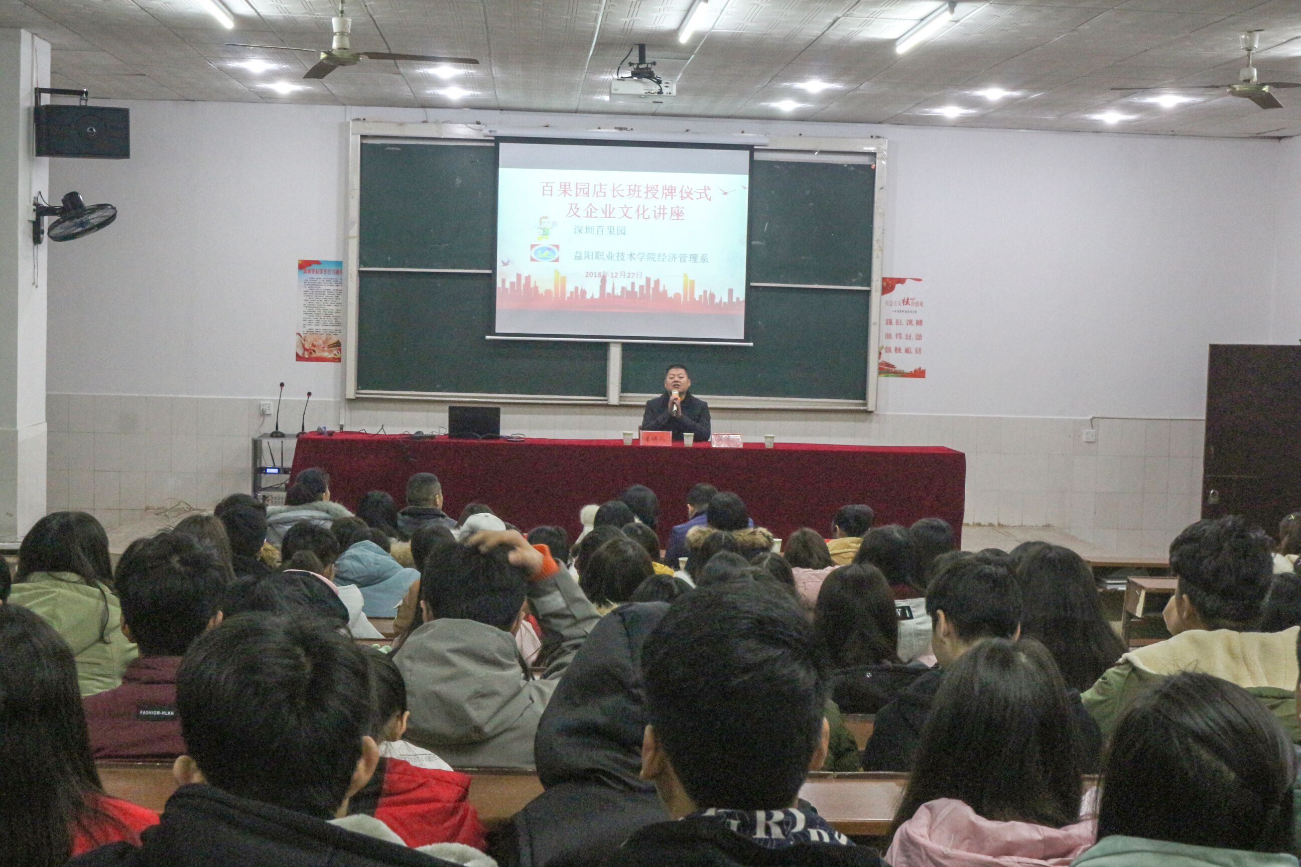 为积极落实全国教育大会精神,坚持深化教育改革创新,益阳职业技术学院经济管理系积极推进校企深度合作,给学生提供实践的平台,提升学生的综合能力,增强学生在就业过程中的竞争力。2018年12月27日下午16:00,百果园店长班授牌仪式及企业文化讲座在二教102教室隆重举行。深圳百果园人力资源经理陈菲、经管系党总支书记唐超文、经管系主任吴自力、经管系副主任蒋亚嫦、学工办主任杨芳、各班辅导员,以及经信17102、经信18102班全体学生参加了此次授牌仪式。会议由吴自力主任主持。