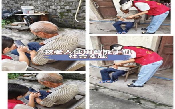 (志愿者唐欢欢在养老院开展关怀服务活动、志愿者赵紫璇帮助老人使用电子设备)