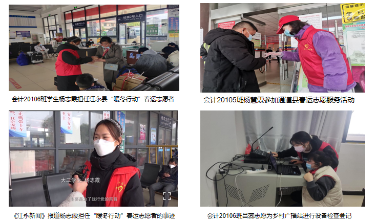 会计20105班杨慧霖返乡后报名参加了2022年通道县“情满旅途·暖冬行动”春运志愿服务活动,为旅客提供出行咨询、行李运输等服务,同时进行疫情防控宣传、创文创卫和文明出行宣传。会计20106班吕蕊加入了怀化市溆浦县大江口镇政府志愿者队伍,为所负责的乡村广播站进行设备检查登记,修改广播平台资源服务器IP地址,更新设置,对乡村广播站负责人进行培训,指导他们正确调试广播系统,确保广播站正常工作。会计20106班学生杨志霞在江永县汽车西站参加“青年志愿行 温暖回家路”青年志愿者服务,重点围绕新冠肺炎疫情防控宣传提醒、换乘指引、秩序维护等实际需求,为春运旅客提供志愿服务,为返乡出行的旅客提供便利、送上温暖。