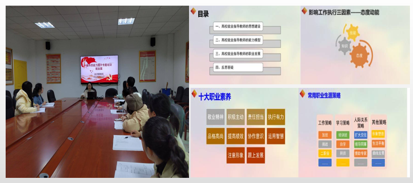 2022年1月2日下午,在四教党建办公室307,益阳职业技术学院经济管理系组织了2022年第一次辅导员能力提升专题培训。此次培训由学工办主任张嫔靓进行主讲,主讲题目为《高校教师就业教育能力与心态提升》。张主任从高校就业指导教师的思想建设、能力模型、职业发展三个方面讲解,针对本学期毕业班学生就业形势及辅导员指导就业工作方面存在的问题,提出要建立完善的辅导员就业指导教育管理体系,构建系统的就业指导模式,进一步完善经管系就业指导教育工作。后期,经管系结合《经管系辅导员能力提升专题培训计划》,根据辅导员工作存在的问题,加强统筹谋划、强化管理考核,进一步优化队伍结构,健全激励机制,着力构建一支素质高、能力强的辅导员队伍。