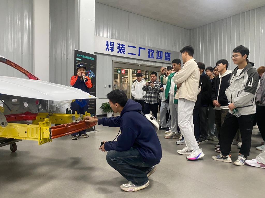 经过两小时车程,佩戴安全帽的同学们踏入吉利生产基地,在讲解员引领下分批参观冲压、焊装、涂装、总装四大工艺车间。机器人精准作业的“智造”现场、数据驱动的自动化流水线,让书本上的冰冷术语变得鲜活。更触动人心的是吉利的“自造”精神——从技术引进到掌握核心科技、布局全球研发,这股“打铁还需自身硬”的工匠精神,让同学们对民族汽车工业崛起有了深刻认知。